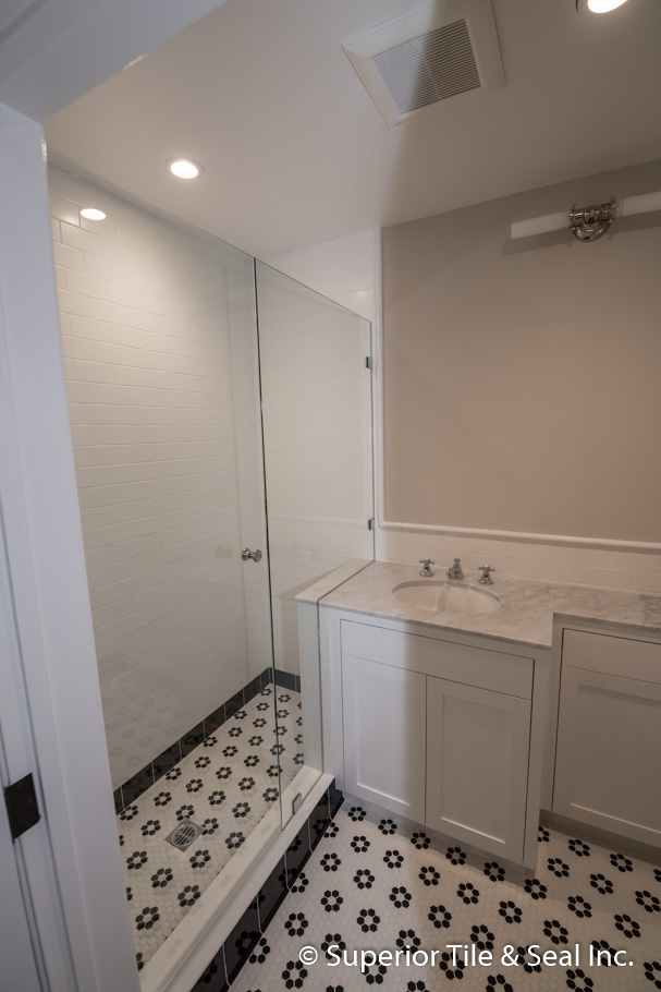 3×6 Wall Tile with Black Base, Retro Flower Floor and Carrara Marble Counter Top