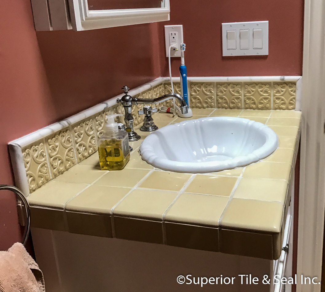 Ceramic Tile Counter with Limestone Mosaic Splash and Deco Tile with Calcutta Trim