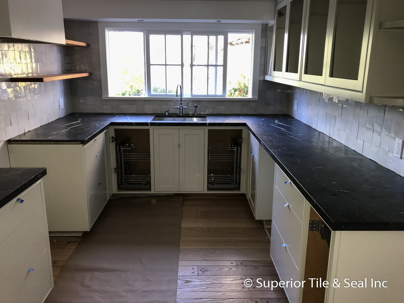 Blackstone Quartz Slab with a Leather Finish. Backsplash with Idris 4×4 Custom Tiles
